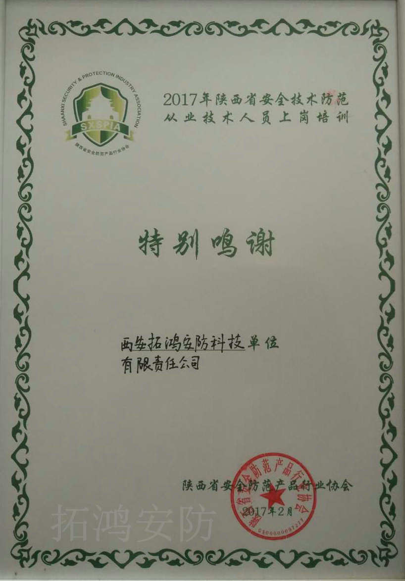 經過(guò)我(wo)公司技(jì)術人員(yuán)取得優(yōu)異的成(chéng)績,并全(quán)員領取(qǔ)了陝🔞西(xi)省安全防(fáng)範此證書(shū)必(bi)備證件(jian)。